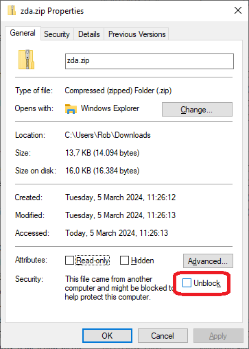 - Klik met de rechter muisknop op zda.zip, kies Eigenschappen (Properties in een Engelstalige Windows installatie), kies rechtsonder in het venstertje voor Deblokkeren (Unblock) en klik op OK.