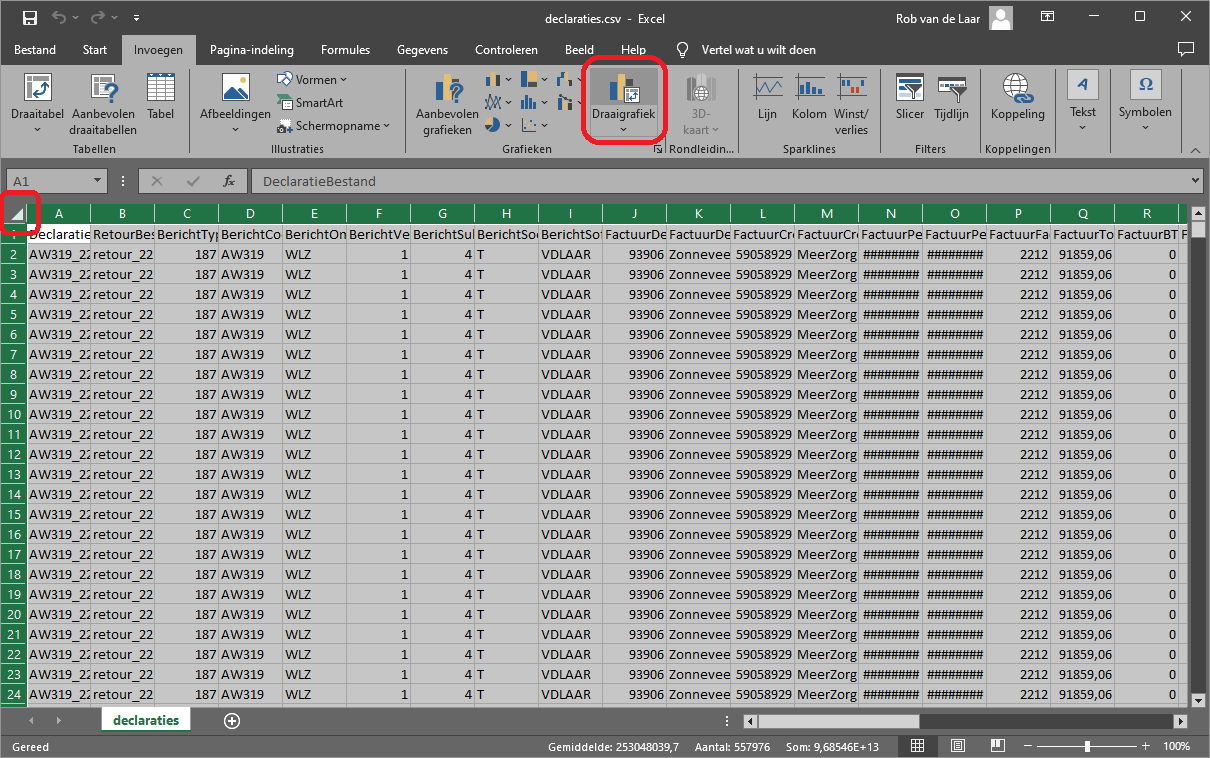 Selecteer hierna alle gegevens door op het hoekje linksboven de spreadsheet te klikken. Kies daarna voor Invoegen > Draaigrafiek:
