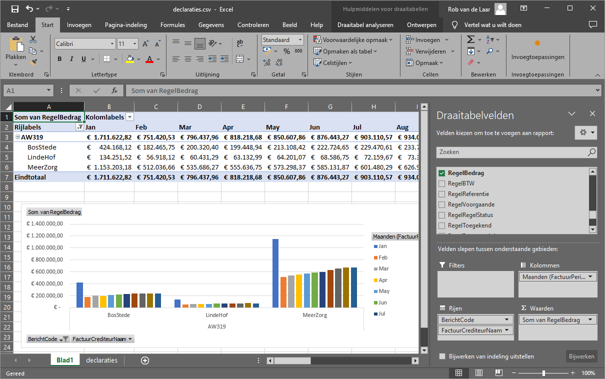 Bouw een draaigrafiek op van de beschikbare gegevens. In het onderstaande voorbeeld de berichtcode en crediteur (zorgaanbieder) op de verticale kolom, de maanden van het jaar horizontaal en de som van de gedeclareerde bedragen als totale waarden.