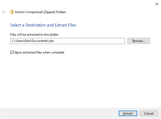 - Klik nogmaals rechts op zda.zip en pak het uit (Alles uitpakken of Extract all). Het gevraagde wachtwoord is staat in de email. Standaard wordt een map genaamd 'zda' aangemaakt. Hierin verschijnen drie of vier bestanden: