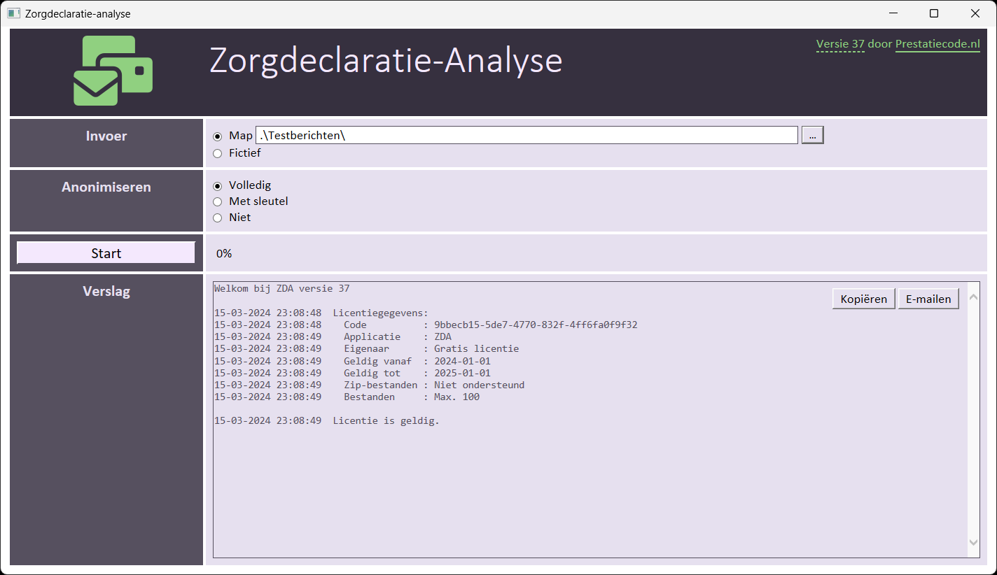 - Eventueel zda-licentie.txt, met uw licentiecode. Zonder dit bestand gebruikt u een gratis proeflicentie, beperkt tot 100 berichten per keer.